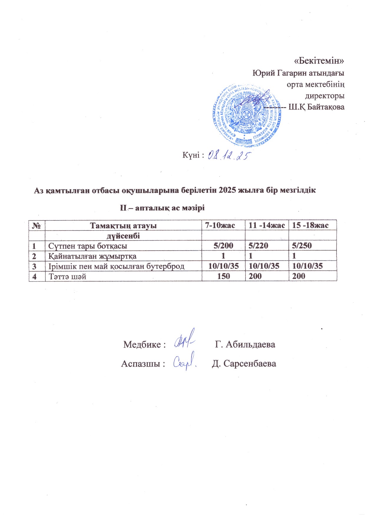 Тегін ыстық тамақпен қамтылған оқушылардың 1 күндік ас мәзірі » сш.им.Гагарина