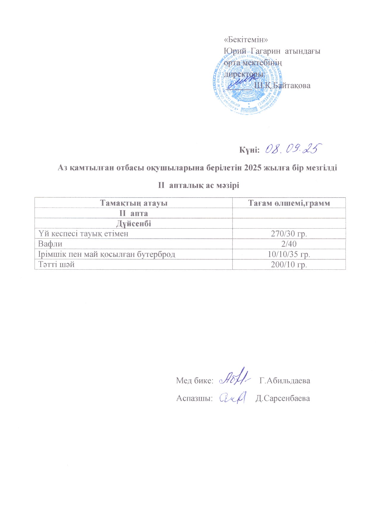 Тегін ыстық тамақпен қамтылған оқушылардың 1 күндік ас мәзірі » сш.им.Гагарина