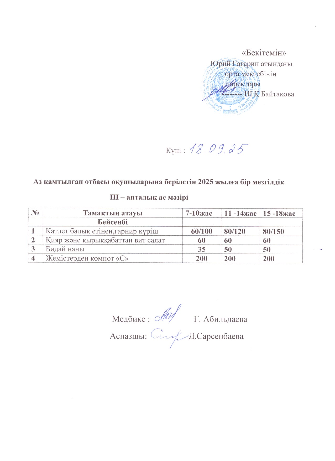 Тегін ыстық тамақпен қамтылған оқушылардың 1 күндік ас мәзірі » сш.им.Гагарина