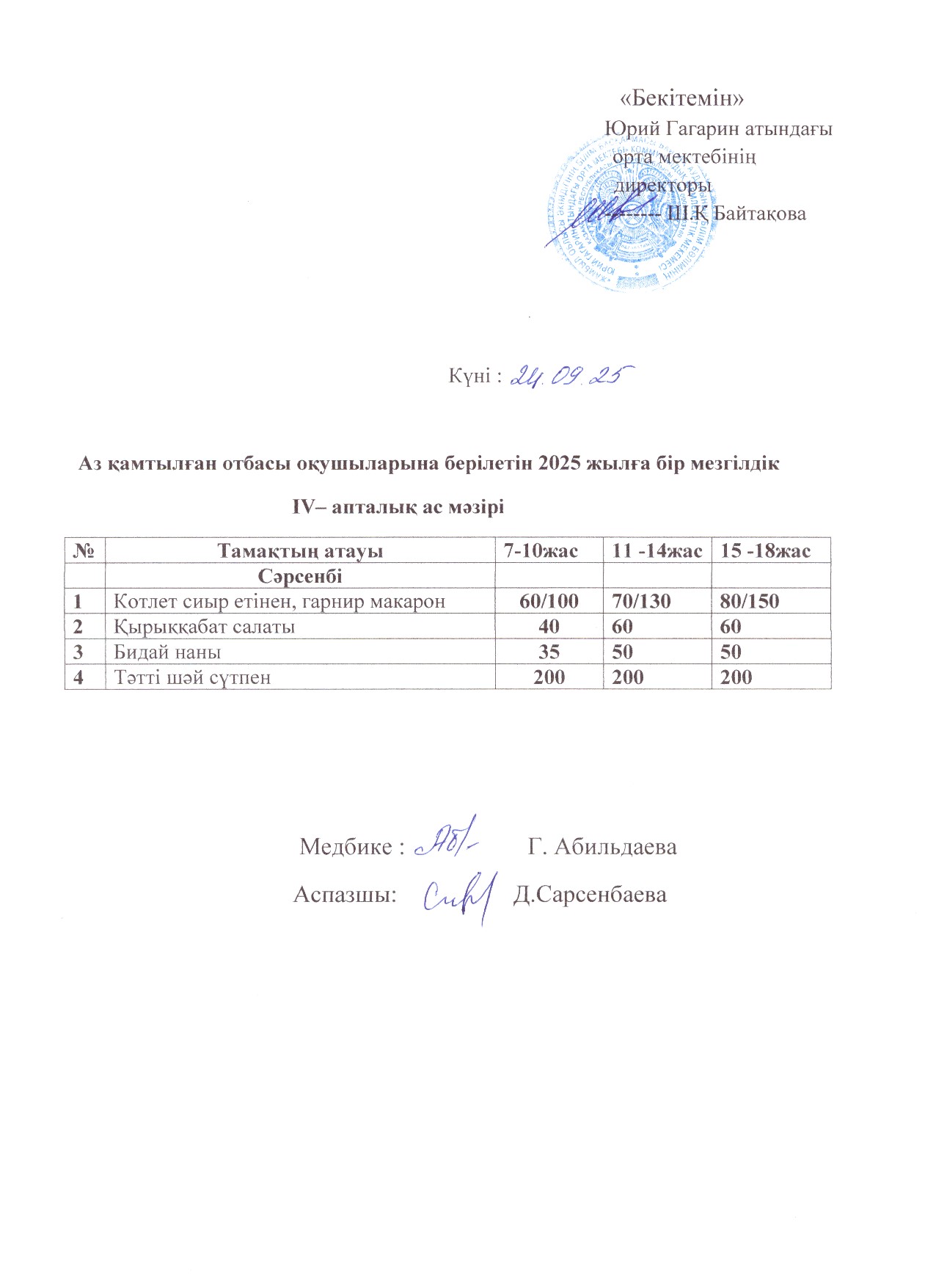 Тегін ыстық тамақпен қамтылған оқушылардың 1 күндік ас мәзірі » сш.им.Гагарина