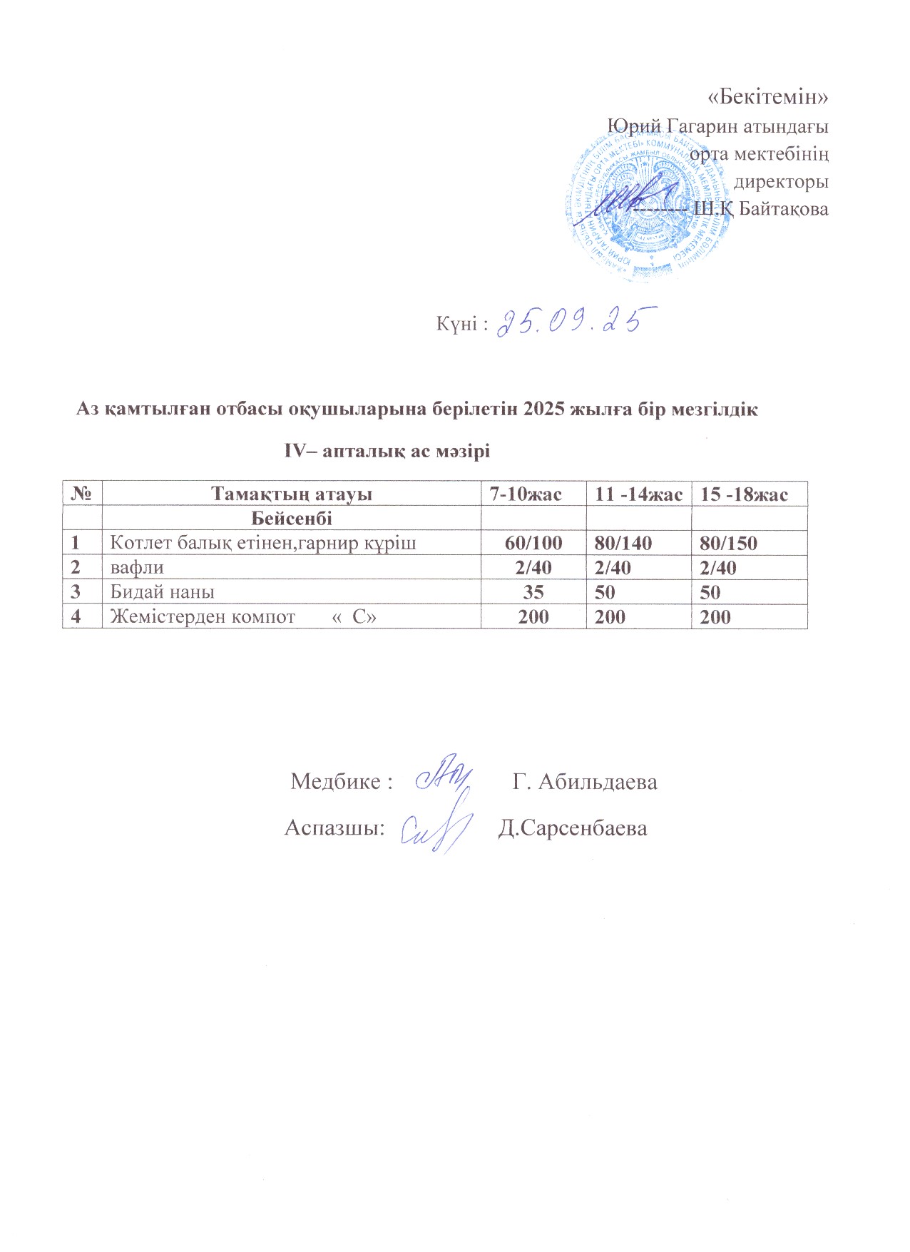 Тегін ыстық тамақпен қамтылған оқушылардың 1 күндік ас мәзірі » сш.им.Гагарина