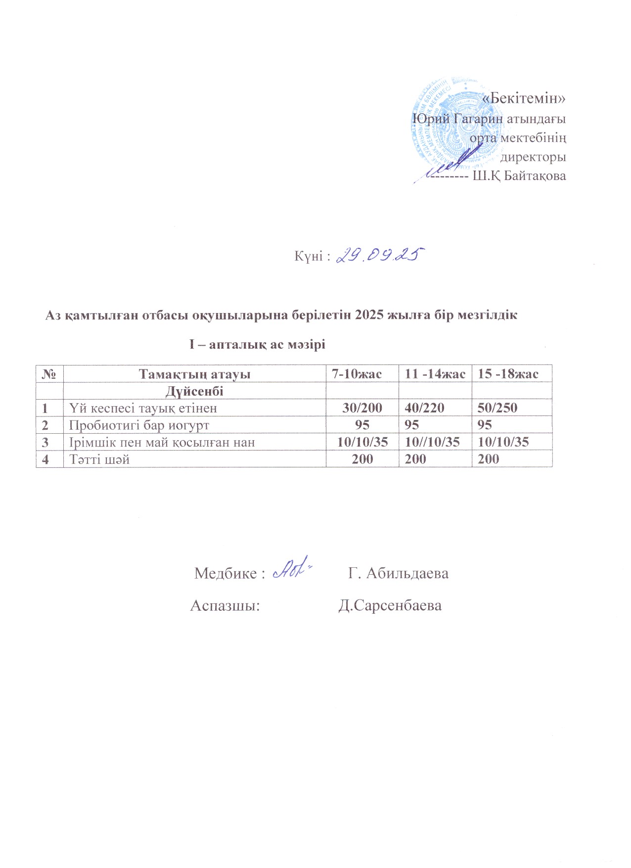 Тегін ыстық тамақпен қамтылған оқушылардың 1 күндік ас мәзірі » сш.им.Гагарина