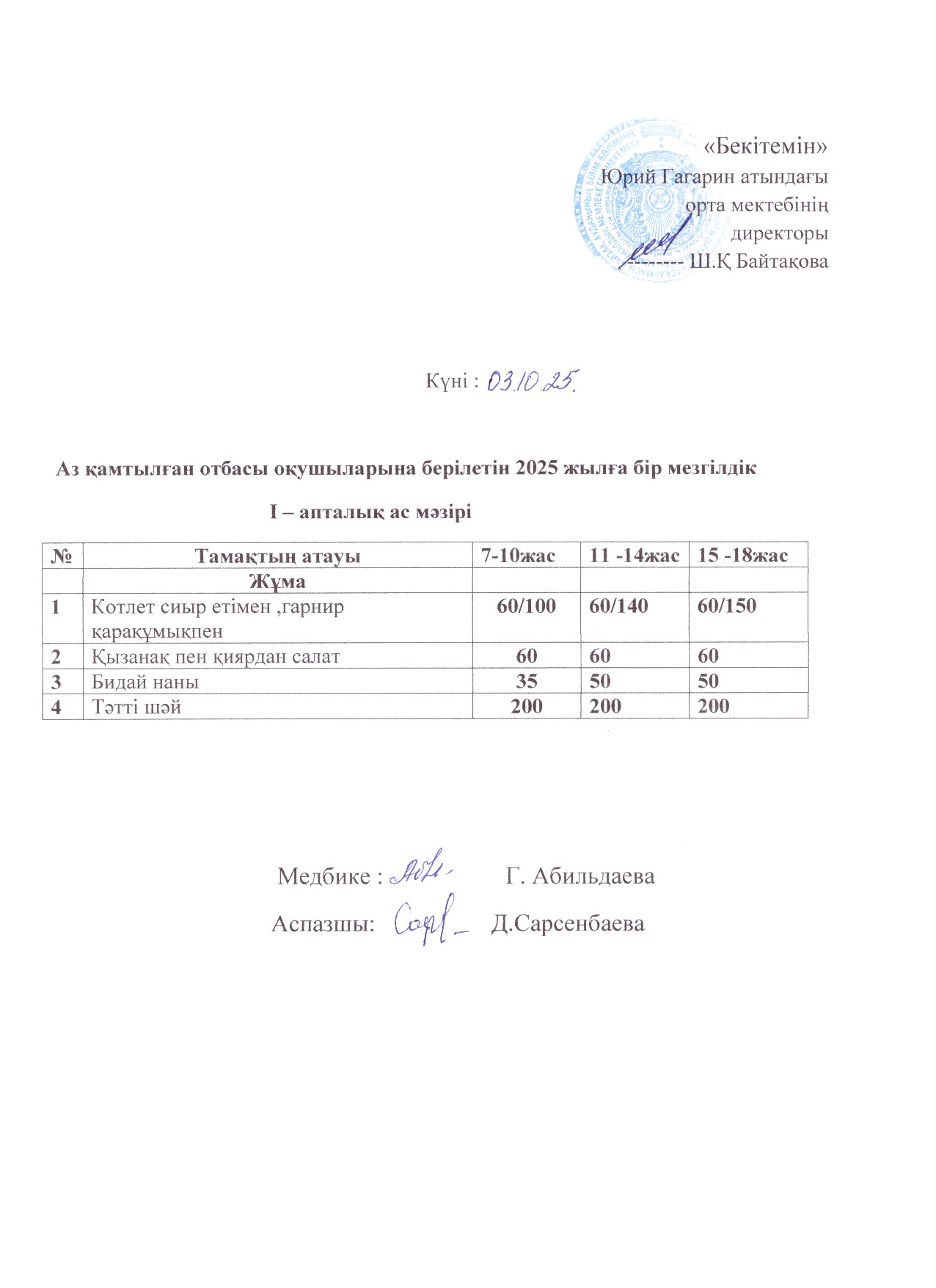 Тегін ыстық тамақпен қамтылған оқушылардың 1 күндік ас мәзірі » сш.им.Гагарина