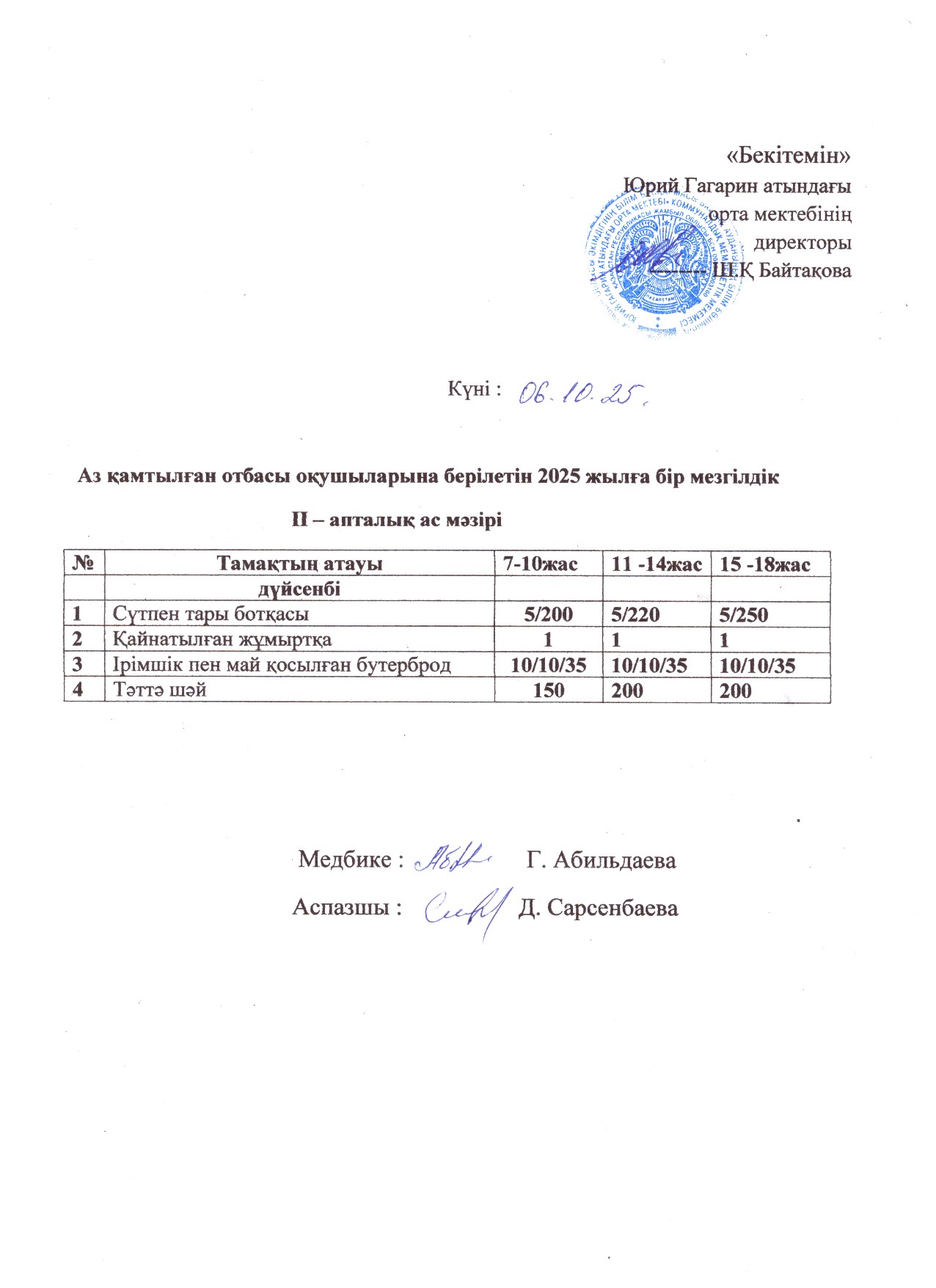 Тегін ыстық тамақпен қамтылған оқушылардың 1 күндік ас мәзірі » сш.им.Гагарина