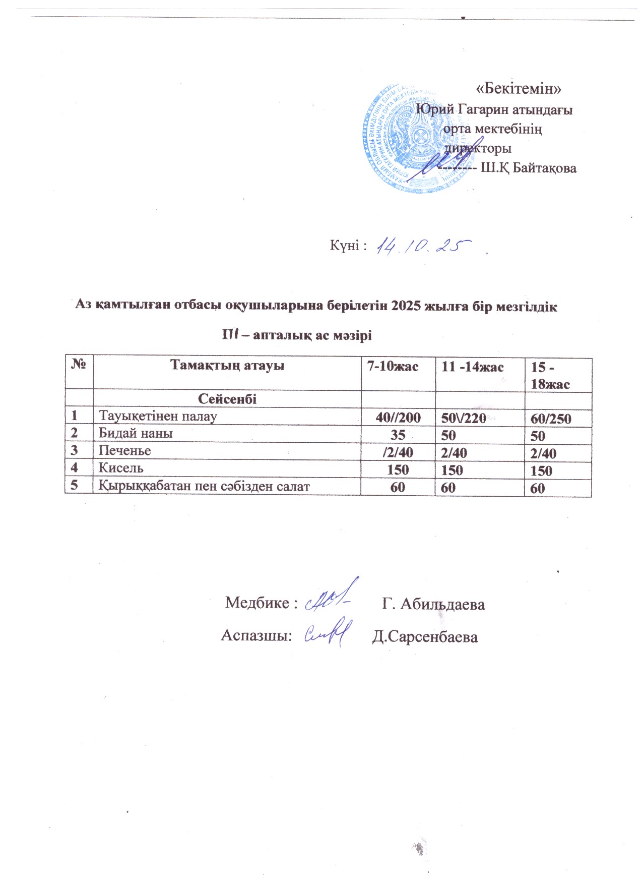 Тегін ыстық тамақпен қамтылған оқушылардың 1 күндік ас мәзірі » сш.им.Гагарина
