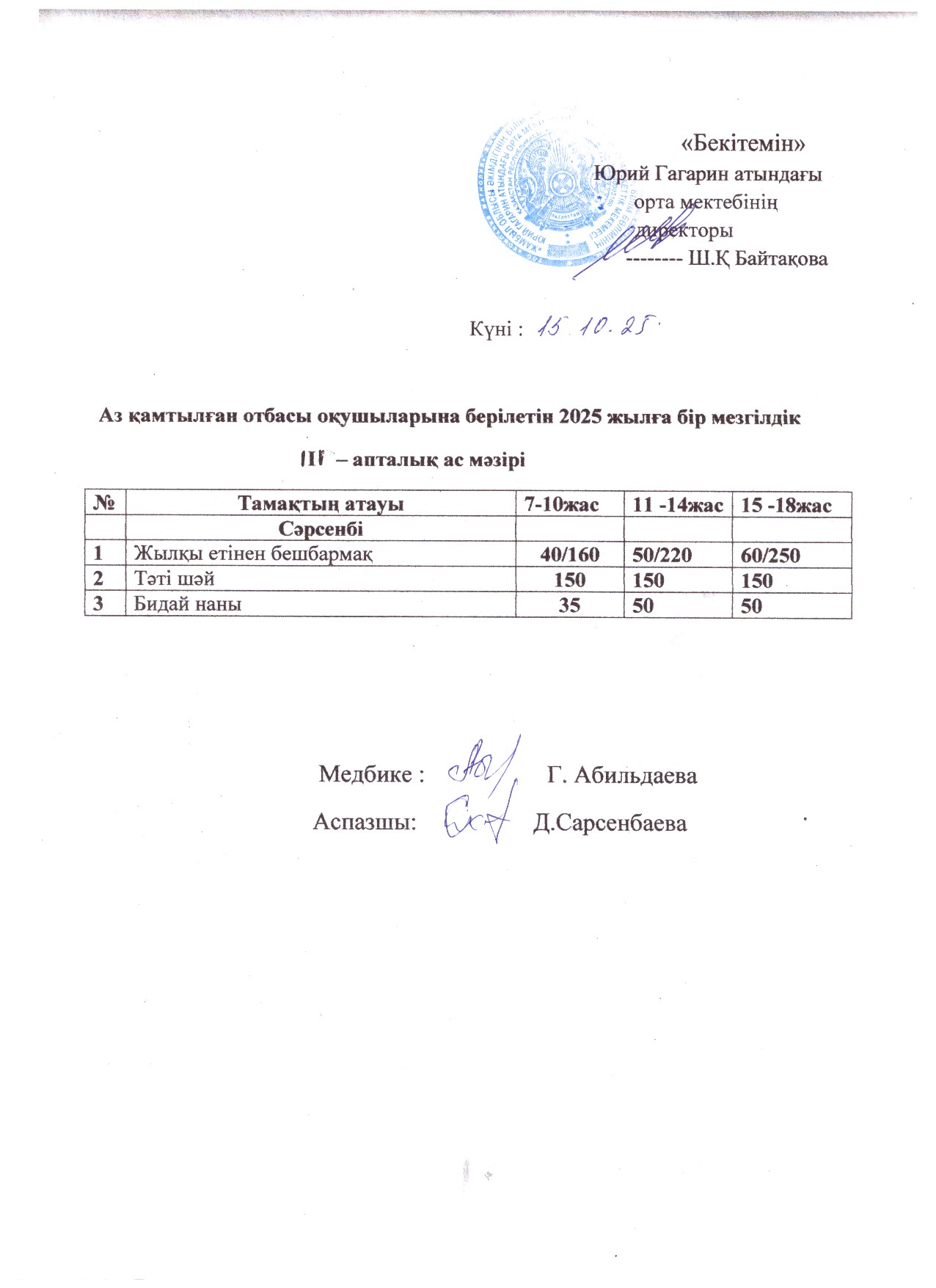 Тегін ыстық тамақпен қамтылған оқушылардың 1 күндік ас мәзірі » сш.им.Гагарина