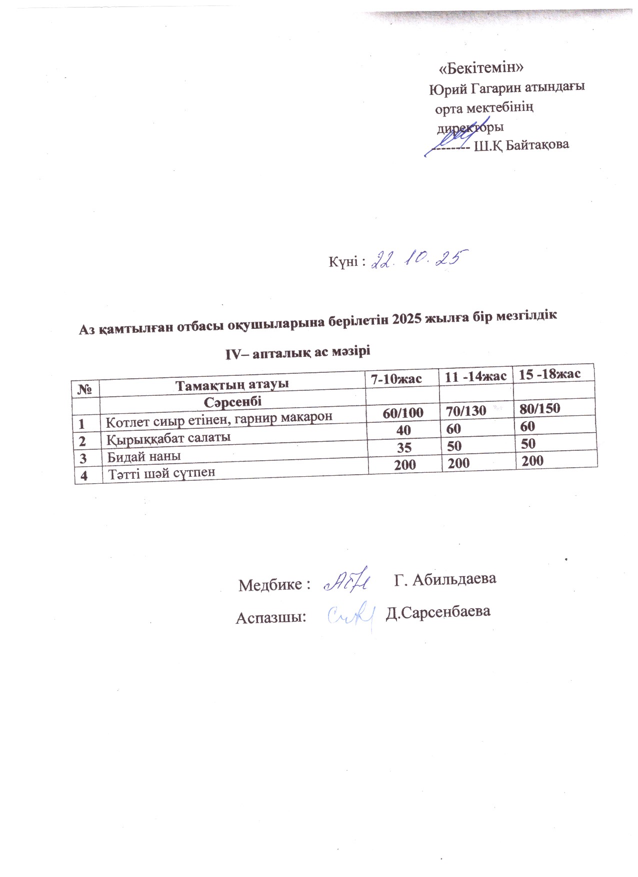 Тегін ыстық тамақпен қамтылған оқушылардың 1 күндік ас мәзірі » сш.им.Гагарина