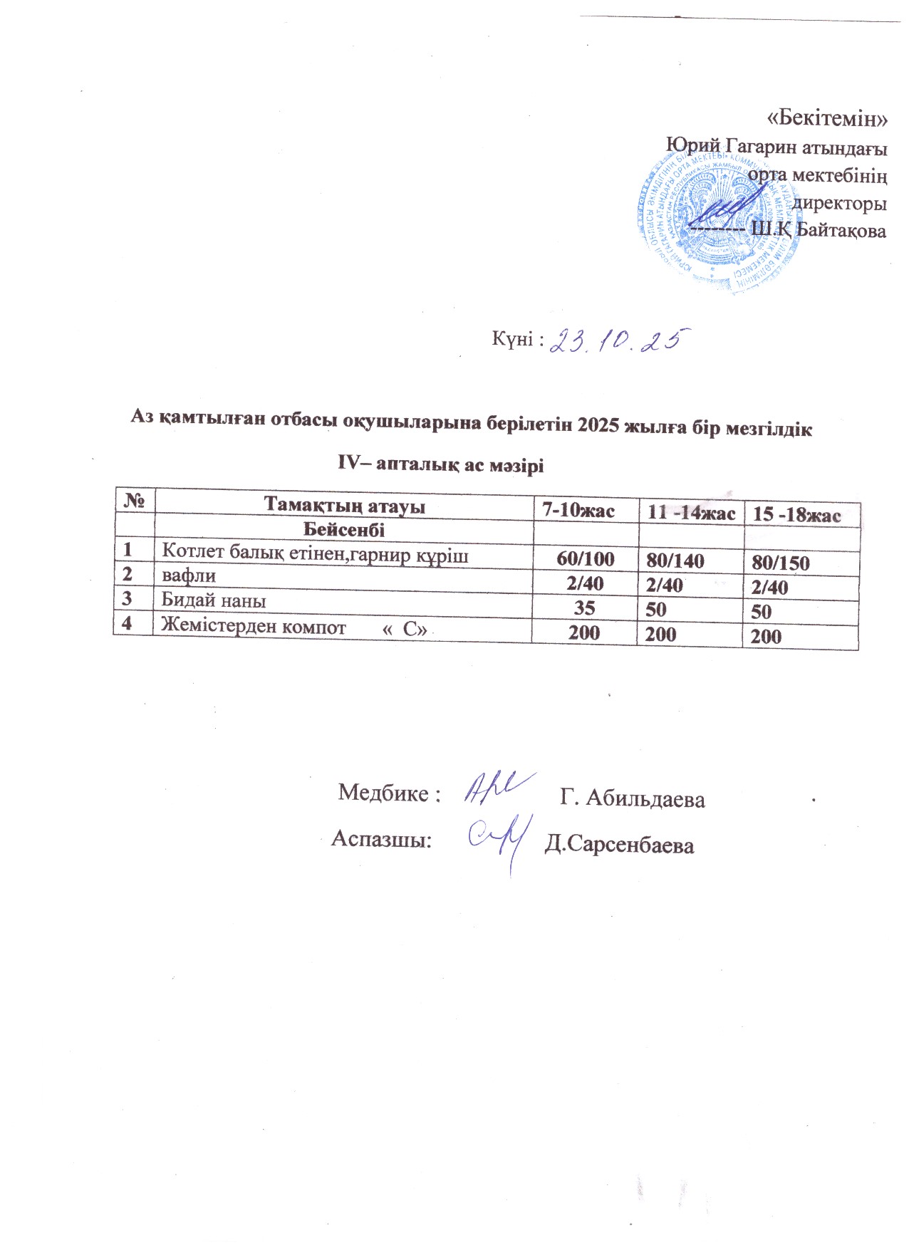 Тегін ыстық тамақпен қамтылған оқушылардың 1 күндік ас мәзірі » сш.им.Гагарина