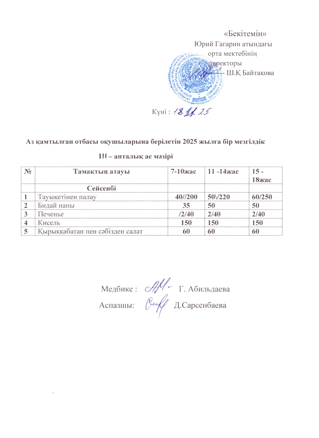 Тегін ыстық тамақпен қамтылған оқушылардың 1 күндік ас мәзірі » сш.им.Гагарина